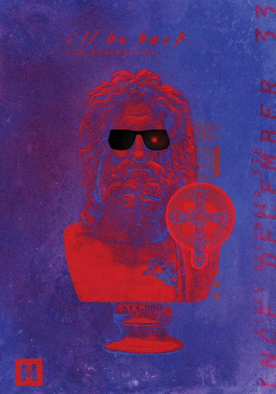 Se liguer pour afficher de l'art à la place de Cette œuvre joue avec les codes iconiques de la culture populaire et de l’imagerie sacrée. Une figure antique, transformée en personnage futuriste, regarde le spectateur à travers des lunettes noires qui détournent le mythe et créent un décalage humoristique. Le titre, clin d’œil assumé au cinéma d’action, renforce le jeu entre tradition et fiction contemporaine. Une affiche qui questionne la manière dont nous recyclons, réinterprétons et réinventons nos propres symboles.